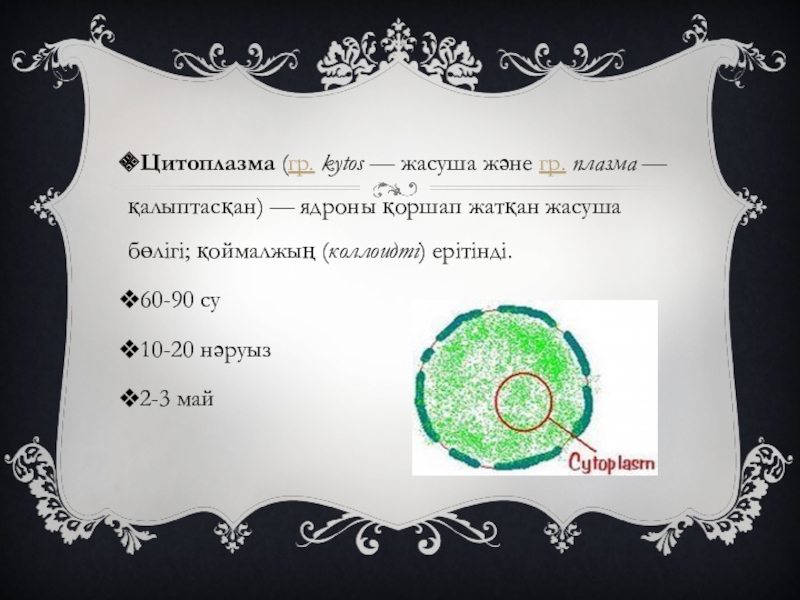 Слайд 4Цитоплазма (гр. kytos — жасуша және гр. плазма — қалыптасқан) — ядроны қоршап жатқан жасуша бөлігі; қоймалжың