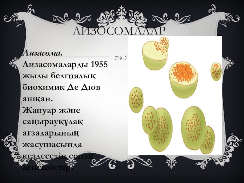 ЛизосомаларЛизасома.Лизасомаларды 1955 жылы белгиялық биохимик Де Дюв ашқан.Жануар және саңырауқұлақ ағзаларының жасушасында кездесетін сопақ денешіктер.