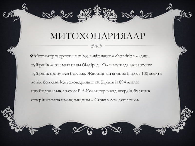 Митохондриялар Митохондрия грекше « mitos »-жіп және « chondrion » -дән, түйіршік деген мағананы білдіреді. Ол жасушада дән