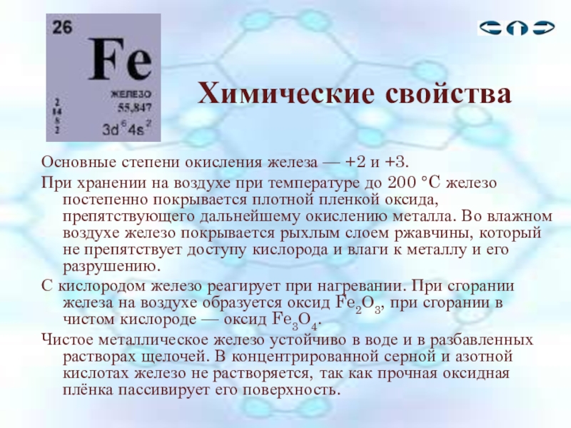 Чистое металлическое железо устойчиво в воде и в разбавленных растворах щелочей. В концентрированной серной и азотной кислотах железо не растворяется, так как прочная оксидная плёнка пассивирует его поверхность.