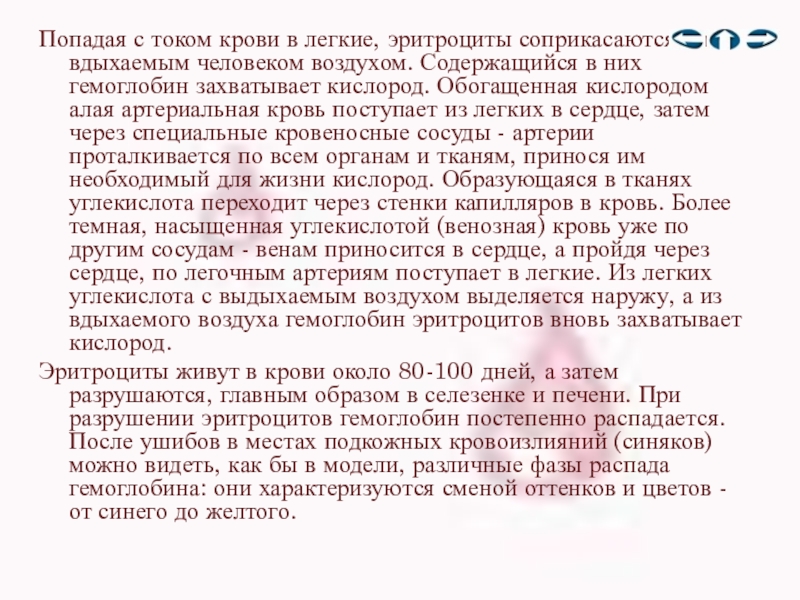 Слайд 14Попадая с током крови в легкие, эритроциты соприкасаются там с вдыхаемым