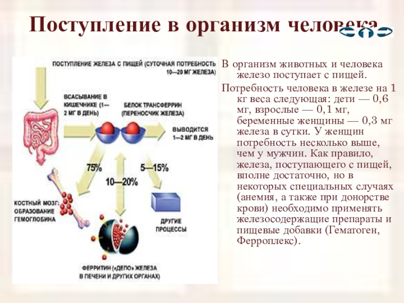 Потребность человека в железе на 1 кг веса следующая: дети — 0,6 мг, взрослые — 0,1 мг, беременные женщины — 0,3 мг железа в сутки. У женщин потребность несколько выше, чем у мужчин. Как правило, железа, поступающего с пищей, вполне достаточно, но в некоторых специальных случаях (анемия, а также при донорстве крови) необходимо применять железосодержащие препараты и пищевые добавки (Гематоген, Ферроплекс).