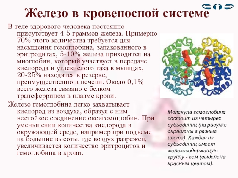 железа. Примерно 70% этого количества требуется для насыщения гемоглобина, запакованного в эритроцитах, 5-10% железа приходится на миоглобин, который участвует в передаче кислорода и углекислого газа в мышцах, 20-25% находятся в резерве, преимущественно в печени. Около 0,1% всего железа связано с белком трансферрином в плазме крови.