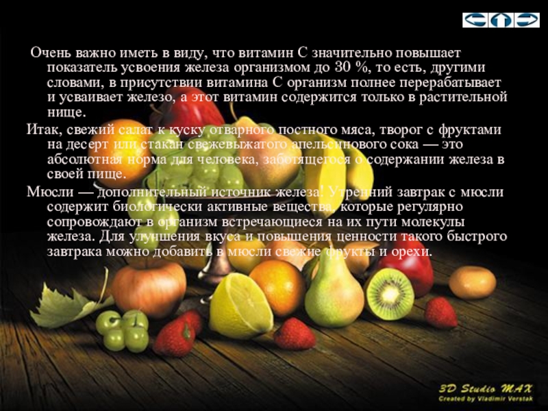 показатель усвоения железа организмом до 30 %, то есть, другими словами, в присутствии витамина С организм полнее перерабатывает и усваивает железо, а этот витамин содержится только в растительной нище.