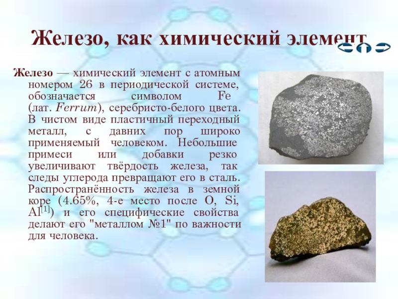 в периодической системе, обозначается символом Fe (лат. Ferrum), серебристо-белого цвета. В чистом виде пластичный переходный металл, с давних пор широко применяемый человеком. Небольшие примеси или добавки резко увеличивают твёрдость железа, так следы углерода превращают его в сталь. Распространённость железа в земной коре (4.65%, 4-е место после O, Si, Al[1]) и его специфические свойства делают его "металлом №1" по важности для человека.