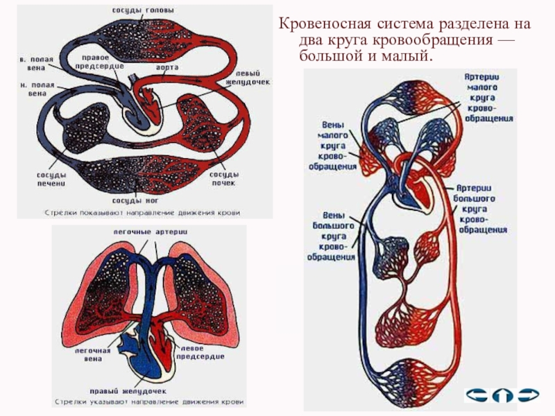 Слайд 10Кровеносная система разделена на два круга кровообращения — большой и малый.