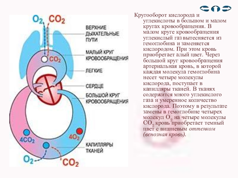 Слайд 15Кругооборот кислорода и углекислоты в большом и малом кругах кровообращения. В