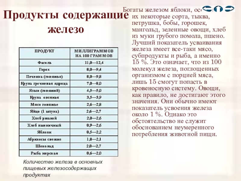 бобы, горошек, мангольд, зеленные овощи, хлеб из муки грубого помола, пшено. Лучший показатель усваивания железа имеет все-таки мясо, субпродукты и рыба, а именно 15 %. Это означает, что из 100 молекул железа, поглощенных организмом с порцией мяса, лишь 15 смогут попасть в кровеносную систему. Овощи, как правило, не достигают этого значения. Они обычно имеют показатель усвоения железа около 1 %. Однако это обстоятельство не служит обоснованием неумеренного потребления животной пищи.