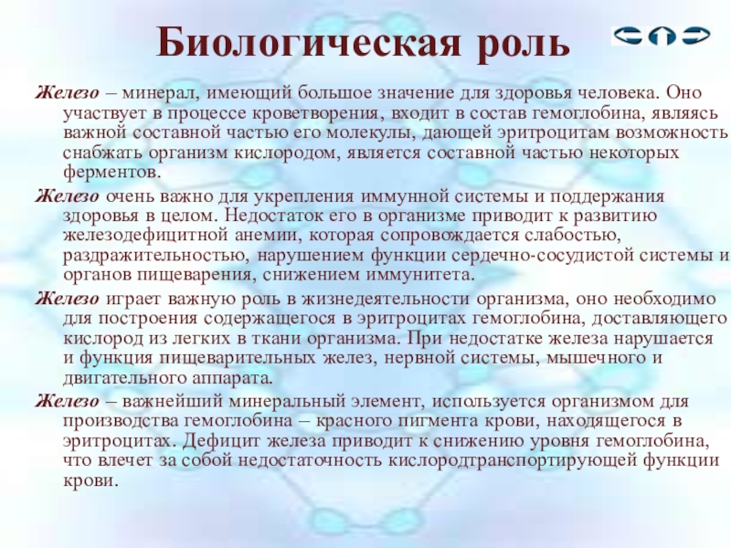 Железо играет важную роль в жизнедеятельности организма, оно необходимо для построения содержащегося в эритроцитах гемоглобина, доставляющего кислород из легких в ткани организма. При недостатке железа нарушается и функция пищеварительных желез, нервной системы, мышечного и двигательного аппарата.