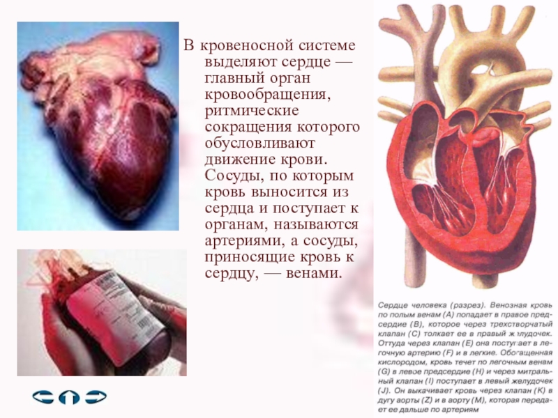 которого обусловливают движение крови. Сосуды, по которым кровь выносится из сердца и поступает к органам, называются артериями, а сосуды, приносящие кровь к сердцу, — венами.