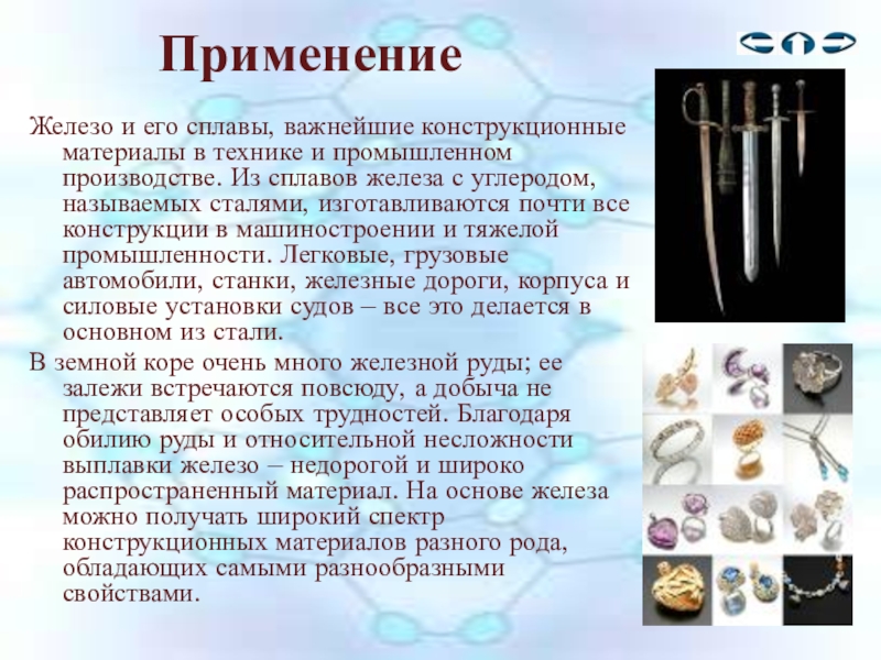 производстве. Из сплавов железа с углеродом, называемых сталями, изготавливаются почти все конструкции в машиностроении и тяжелой промышленности. Легковые, грузовые автомобили, станки, железные дороги, корпуса и силовые установки судов – все это делается в основном из стали.
