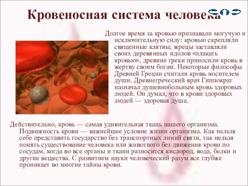 Действительно, кровь — самая удивительная ткань нашего организма. Подвижность крови — важнейшее условие жизни организма. Как нельзя себе представить государство без транспортных линий связи, так нельзя понять существование человека или животного без движения крови по сосудам, когда во все органы и ткани разносится кислород, вода, белки и другие вещества. С развитием науки человеческий разум все глубже проникает во многие тайны крови.