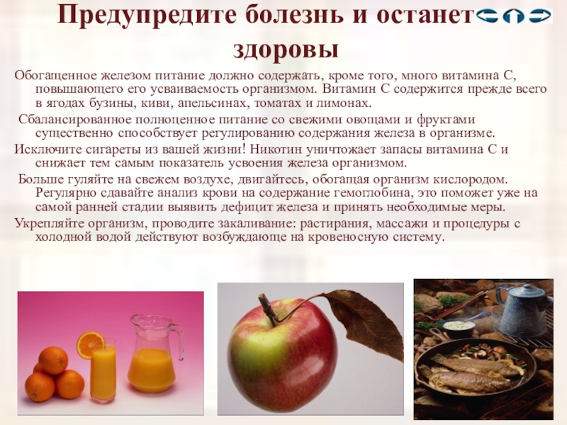 Исключите сигареты из вашей жизни! Никотин уничтожает запасы витамина С и снижает тем самым показатель усвоения железа организмом.