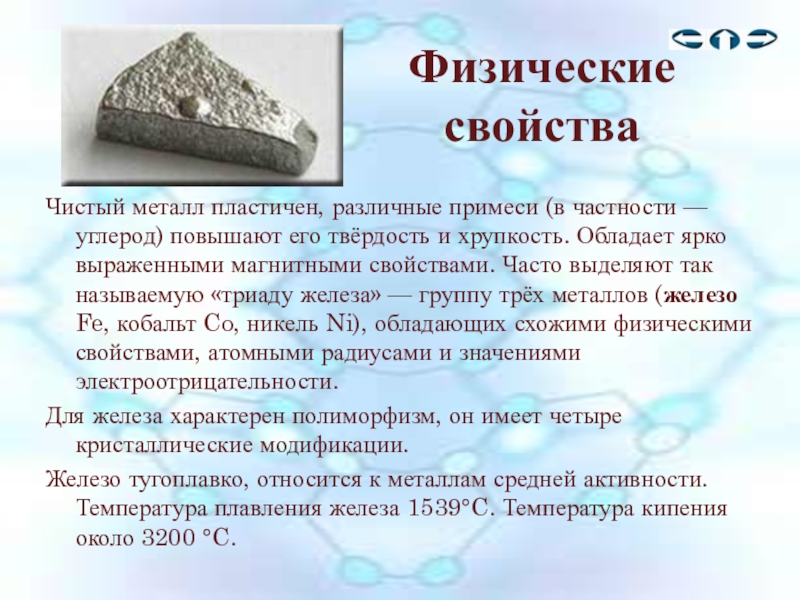 его твёрдость и хрупкость. Обладает ярко выраженными магнитными свойствами. Часто выделяют так называемую «триаду железа» — группу трёх металлов (железо Fe, кобальт Co, никель Ni), обладающих схожими физическими свойствами, атомными радиусами и значениями электроотрицательности.