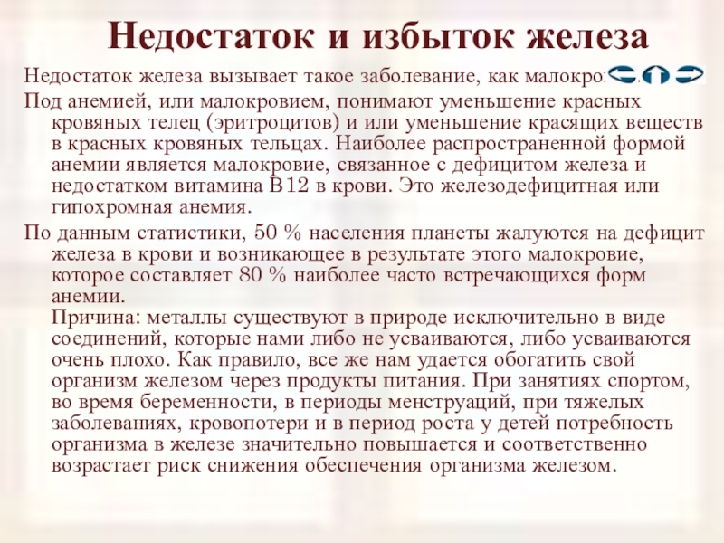 Причина: металлы существуют в природе исключительно в виде соединений, которые нами либо не усваиваются, либо усваиваются очень плохо. Как правило, все же нам удается обогатить свой организм железом через продукты питания. При занятиях спортом, во время беременности, в периоды менструаций, при тяжелых заболеваниях, кровопотери и в период роста у детей потребность организма в железе значительно повышается и соответственно возрастает риск снижения обеспечения организма железом.