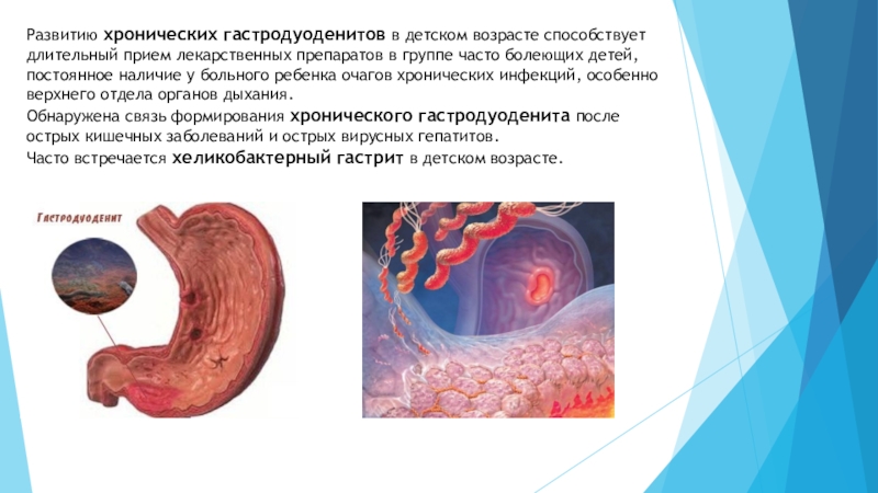 Слайд 7Развитию хронических гастродуоденитов в детском возрасте способствует длительный прием лекарственных препаратов