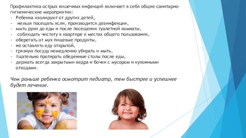 Слайд 20Профилактика острых кишечных инфекций включает в себя общие санитарно-гигиенические мероприятия: