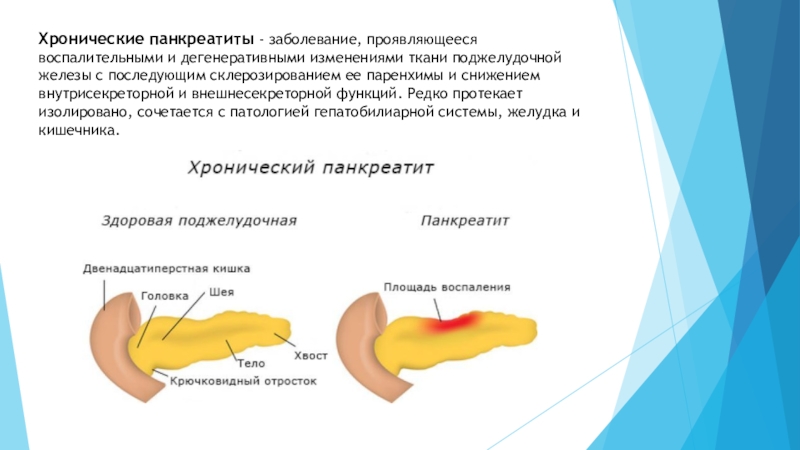 Слайд 15Хронические панкреатиты - заболевание, проявляющееся воспалительными и дегенеративными изменениями ткани поджелудочной