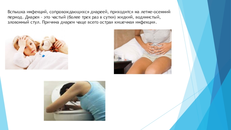 Слайд 19Вспышка инфекций, сопровождающихся диареей, приходится на летне-осенний период. Диарея - это