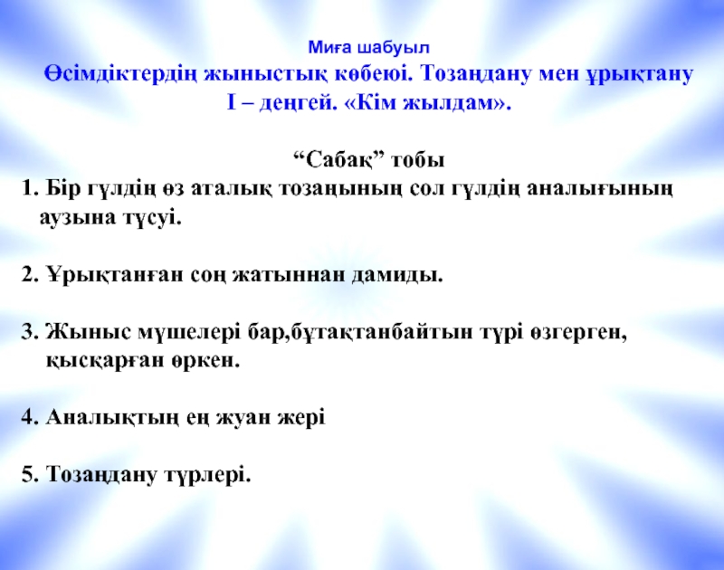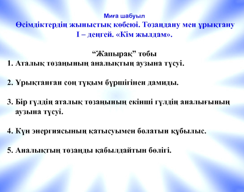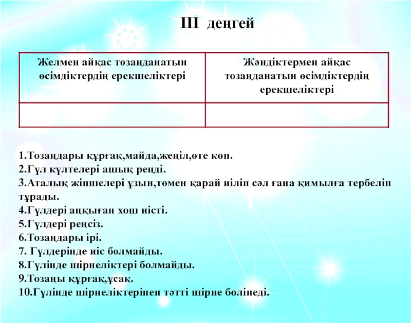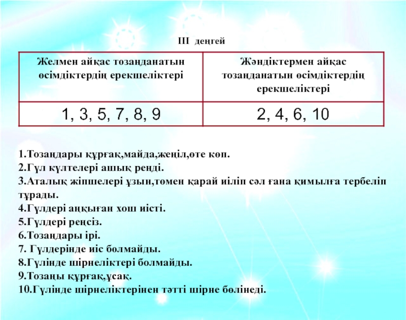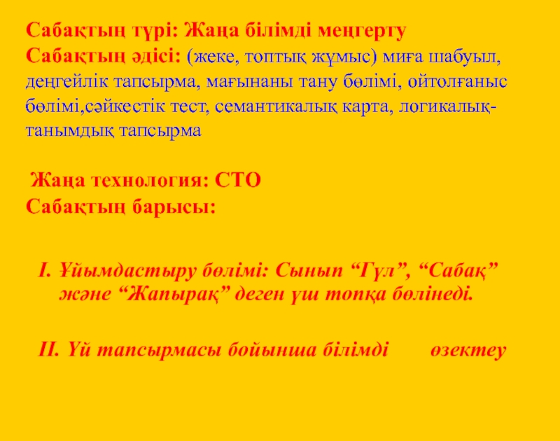І. Ұйымдастыру бөлімі: Сынып “Гүл”, “Сабақ” және “Жапырақ” деген үш топқа бөлінеді.
