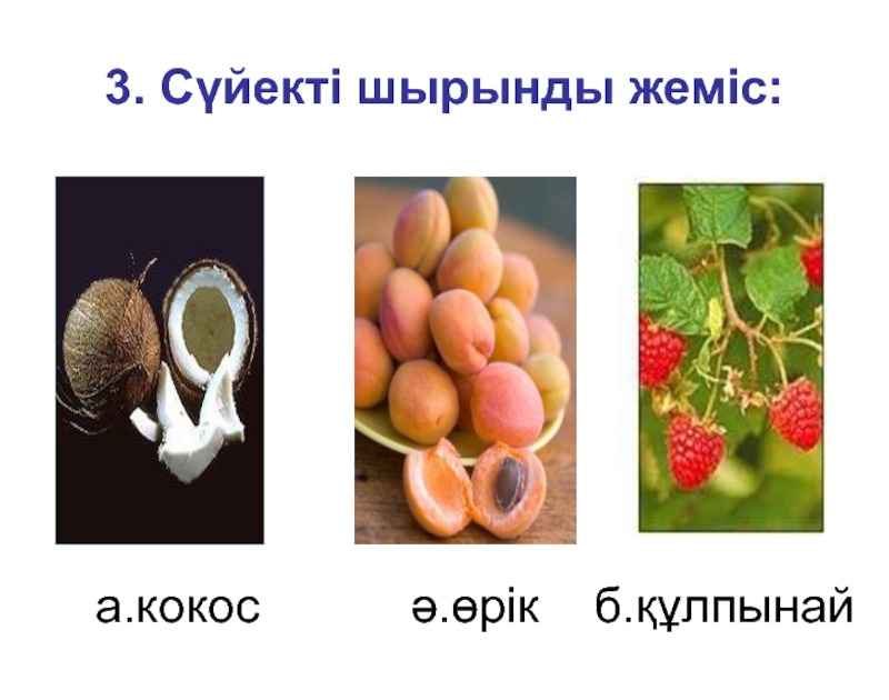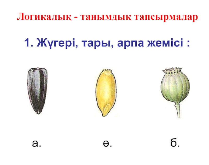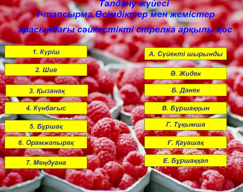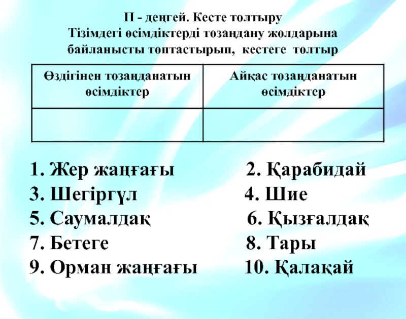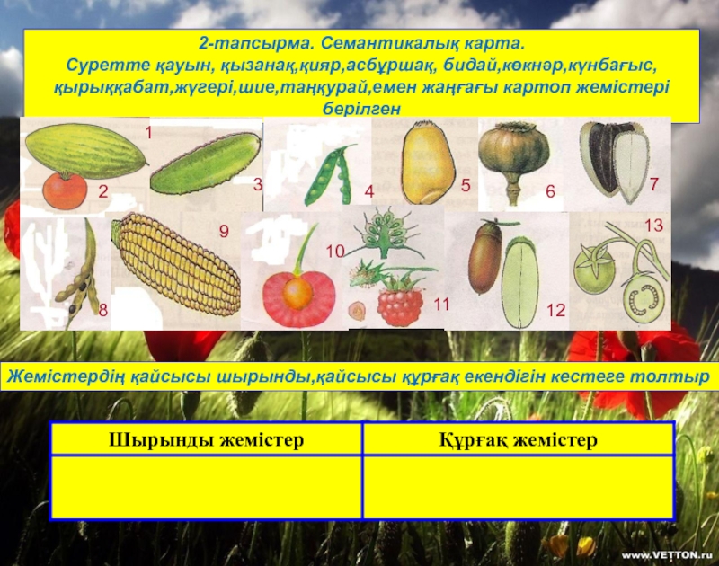 1. Жер жаңғағы 2. Қарабидай 3. Шегіргүл 4. Шие 5. Саумалдақ 6. Қызғалдақ 7. Бетеге 8. Тары 9. Орман жаңғағы 10. Қалақай