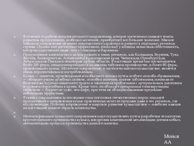 особенно молочное, приобретает все большее значение. Мясное табунное направление не имеет повсеместного характера и развито в отдельных регионах страны. Однако оно достаточно эффективно, поскольку у конины невысокая себестоимость, которая существенно ниже, чем у говядины и баранины.