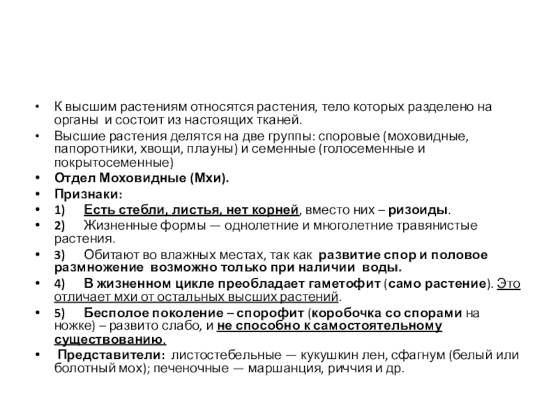 Слайд 12К высшим растениям относятся растения, тело которых разделено на органы и