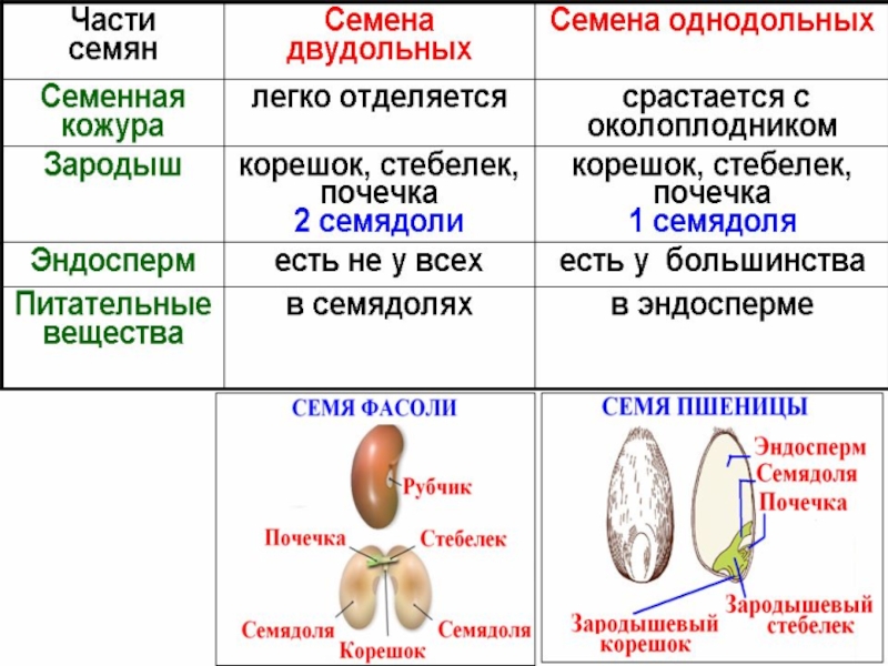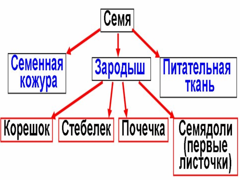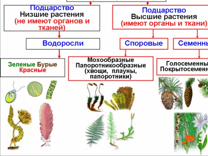 Высшие растения делятся на две группы: споровые (моховидные, папоротники, хвощи, плауны) и семенные (голосеменные и покрытосеменные)