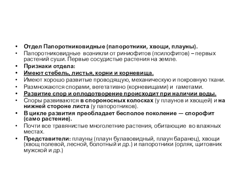 Папоротниковидные возникли от риниофитов (псилофитов) – первых растений суши. Первые сосудистые