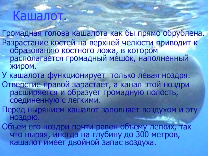 Объем его ноздри почти равен объему легких, так что ныряя, иногда на глубину до 300 метров, кашалот имеет двойной запас воздуха.