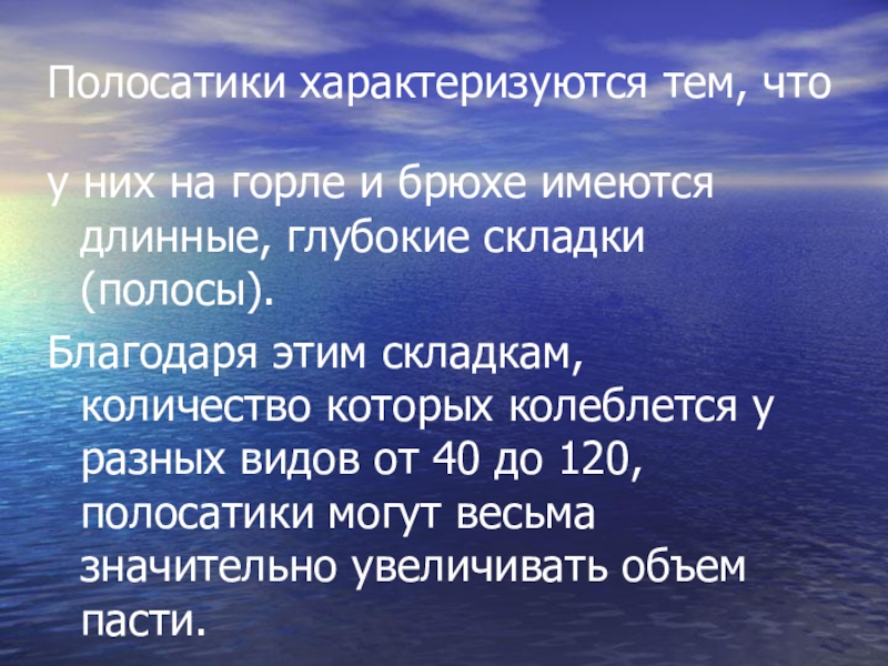 Благодаря этим складкам, количество которых колеблется у разных видов от 40 до 120, полосатики могут весьма значительно увеличивать объем пасти.