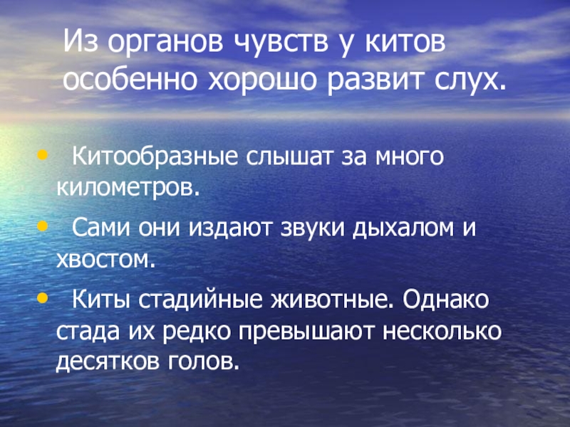 Слайд 16Из органов чувств у китов особенно хорошо развит слух.