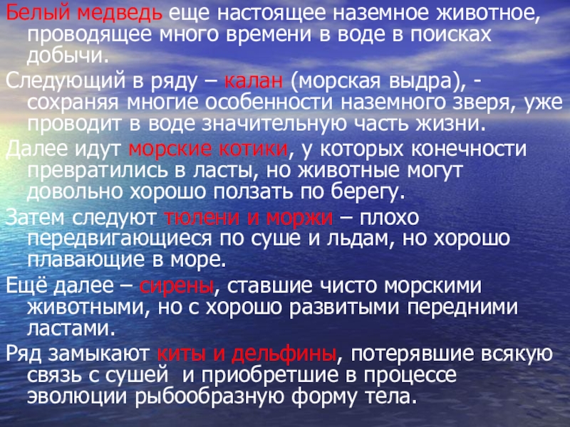 животные приспособились к жизни в воде. Среди морских млекопитающих можно увидеть все стадии перехода от наземного к водному образу жизни.