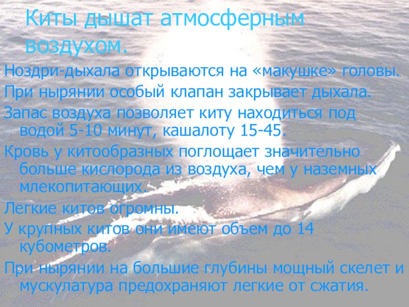 Запас воздуха позволяет киту находиться под водой 5-10 минут, кашалоту 15-45.