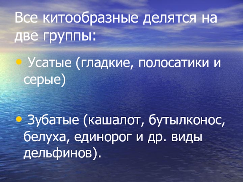 Китообразные: беззубые или усатые киты (гладкие, полосатики и серые) и зубатые киты (кашалоты и дельфины).