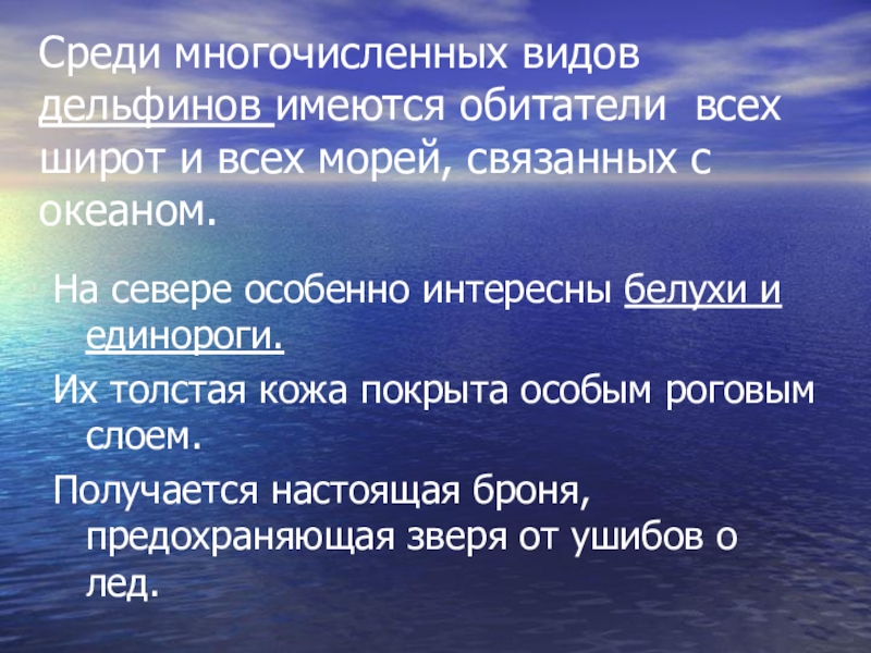 Слайд 26Среди многочисленных видов дельфинов имеются обитатели всех широт и всех морей,