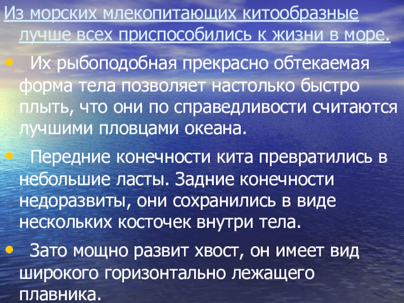Слайд 8Из морских млекопитающих китообразные лучше всех приспособились к жизни в море.