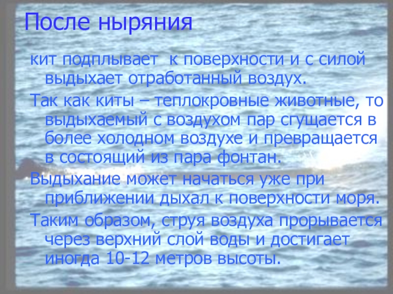 как киты – теплокровные животные, то выдыхаемый с воздухом пар сгущается в более холодном воздухе и превращается в состоящий из пара фонтан.