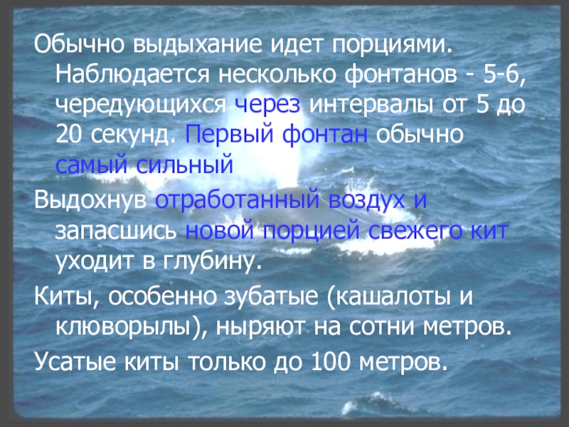 Слайд 15Обычно выдыхание идет порциями. Наблюдается несколько фонтанов - 5-6, чередующихся через