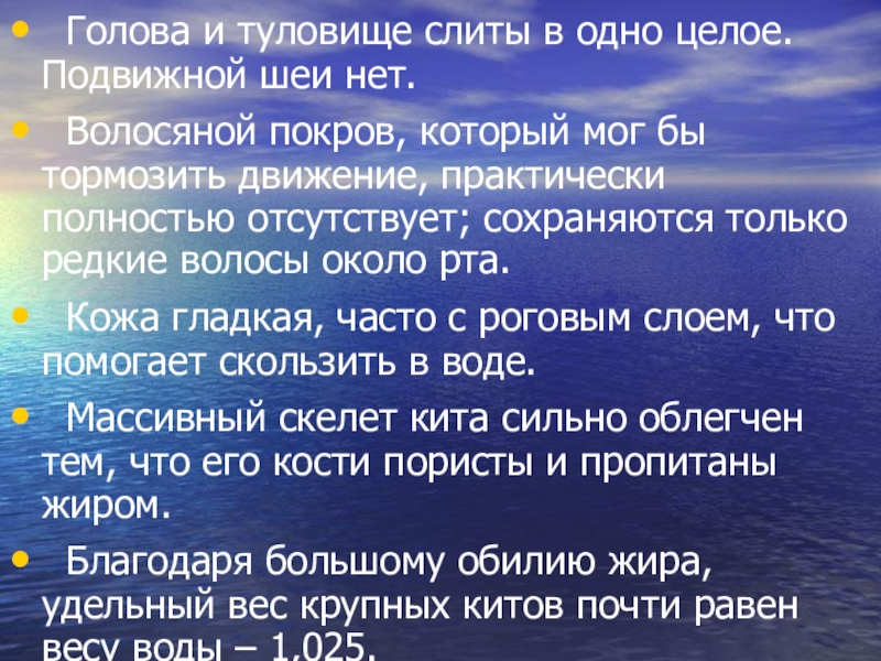 Благодаря большому обилию жира, удельный вес крупных китов почти равен весу воды – 1,025.