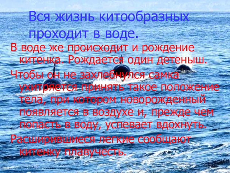 Слайд 10Вся жизнь китообразных проходит в воде.