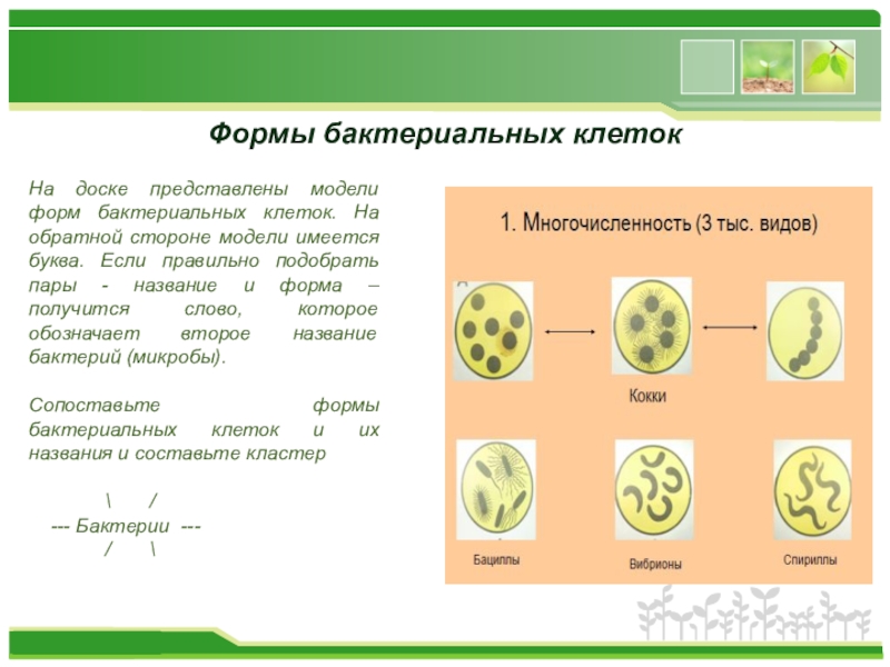 стороне модели имеется буква. Если правильно подобрать пары - название и форма – получится слово, которое обозначает второе название бактерий (микробы).