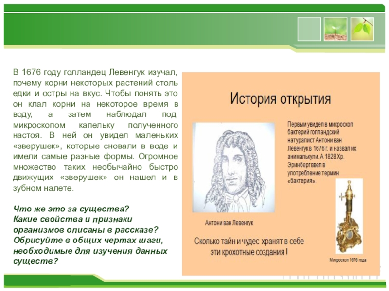 Слайд 3В 1676 году голландец Левенгук изучал, почему корни некоторых растений столь