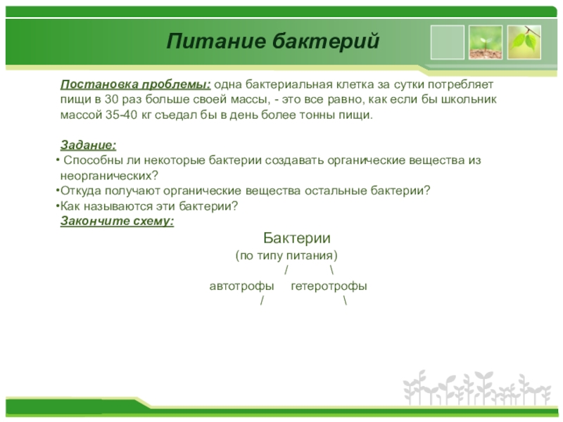 Постановка проблемы: одна бактериальная клетка за сутки потребляет пищи в