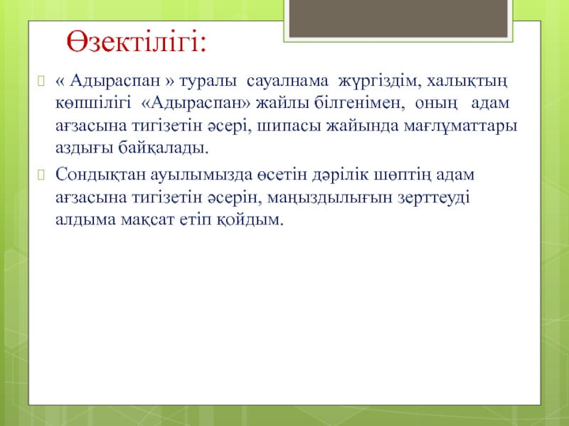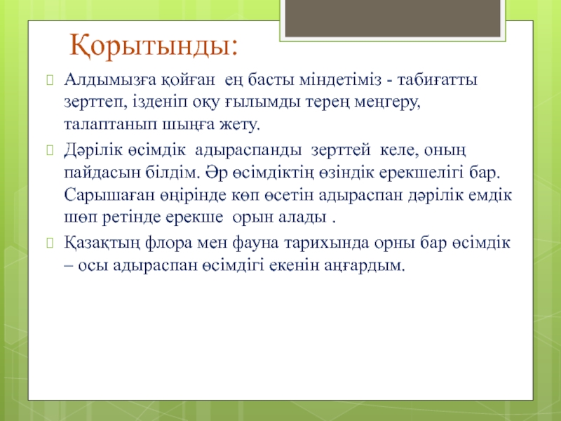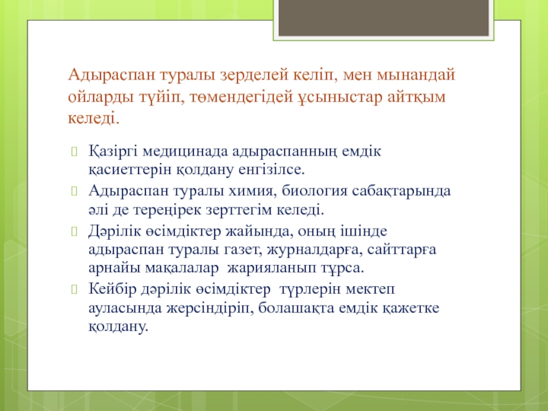 Адыраспан туралы химия, биология сабақтарында әлі де тереңірек зерттегім келеді.