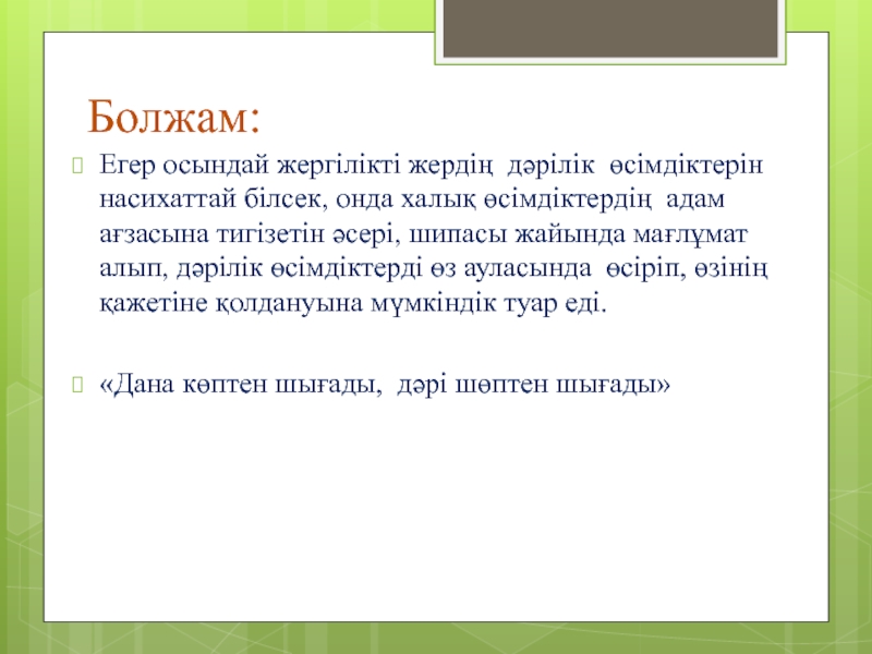 Кейбір дәрілік өсімдіктер түрлерін мектеп ауласында жерсіндіріп, болашақта емдік қажетке қолдану.