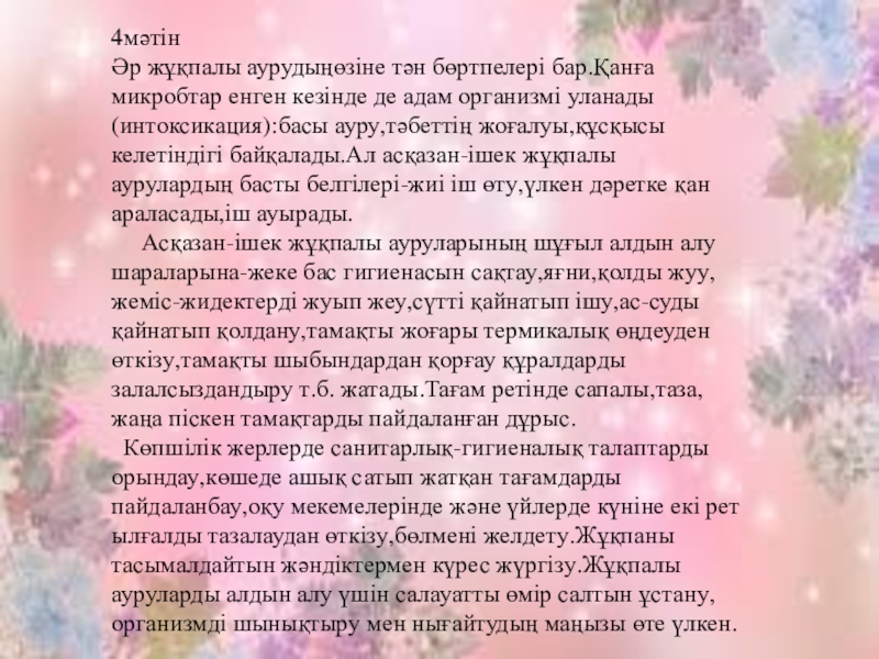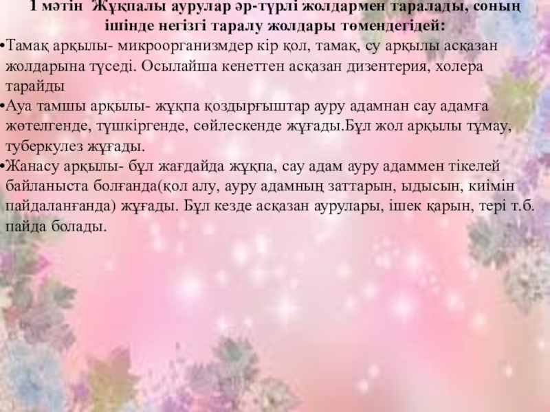 Жұқпалы аурулардың алғашқы белгілері-адамның дене қызуы +38+40 С дейін көтеріледі,жалпы әлсіздік,тері қабатында түрлі бөртпелер пайда болады,олар қызыл түстен ірің деуге дейін айналады.
