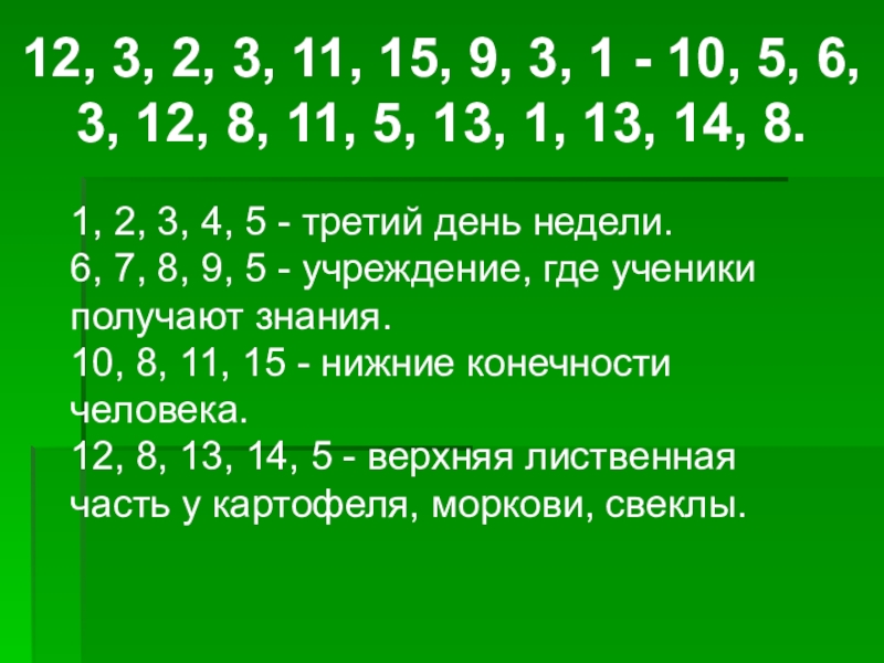 12, 8, 13, 14, 5 - верхняя лиственная часть у картофеля, моркови, свеклы.