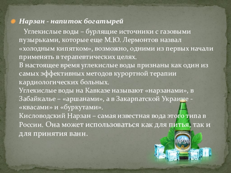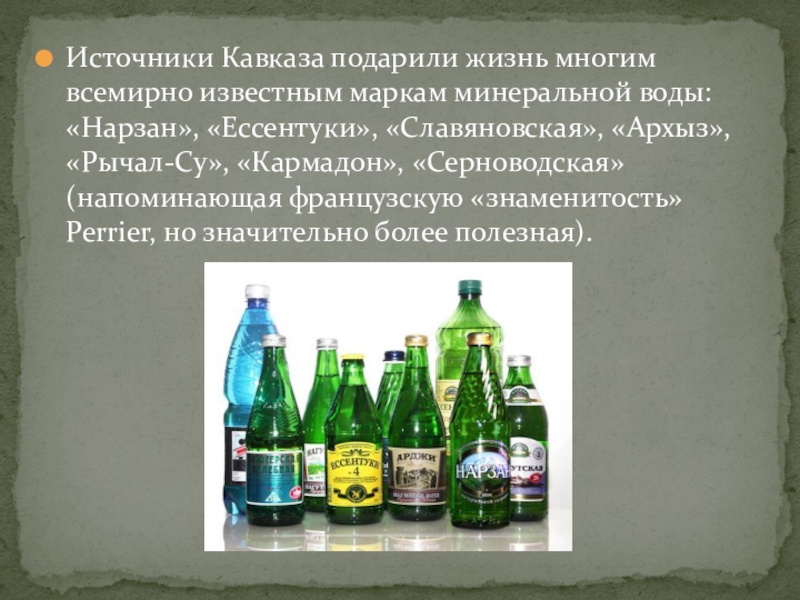 Слайд 6Источники Кавказа подарили жизнь многим всемирно известным маркам минеральной воды: «Нарзан»,