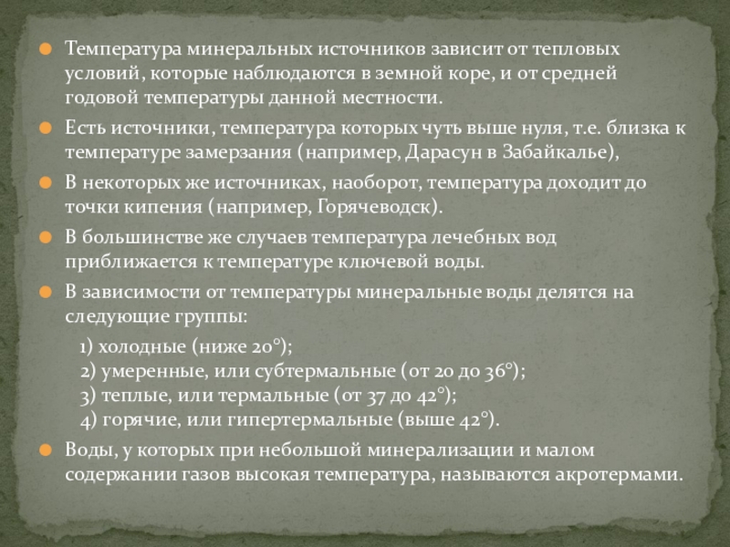 Слайд 10Температура минеральных источников зависит от тепловых условий, которые наблюдаются в земной